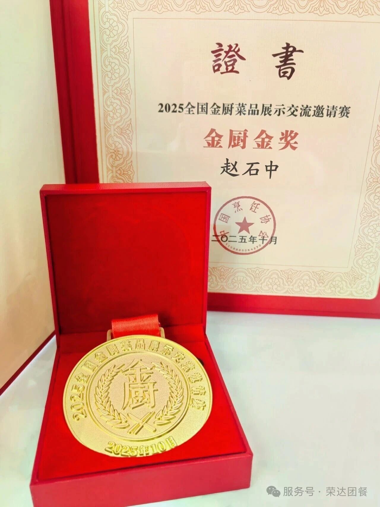 在交流邀请赛中荣达餐饮集团总经理赵石中凭借深厚的烹饪造诣与创新实践,斩获 “金厨金奖”。这不仅是赵总个人的荣誉,也是荣达餐饮集团的骄傲。